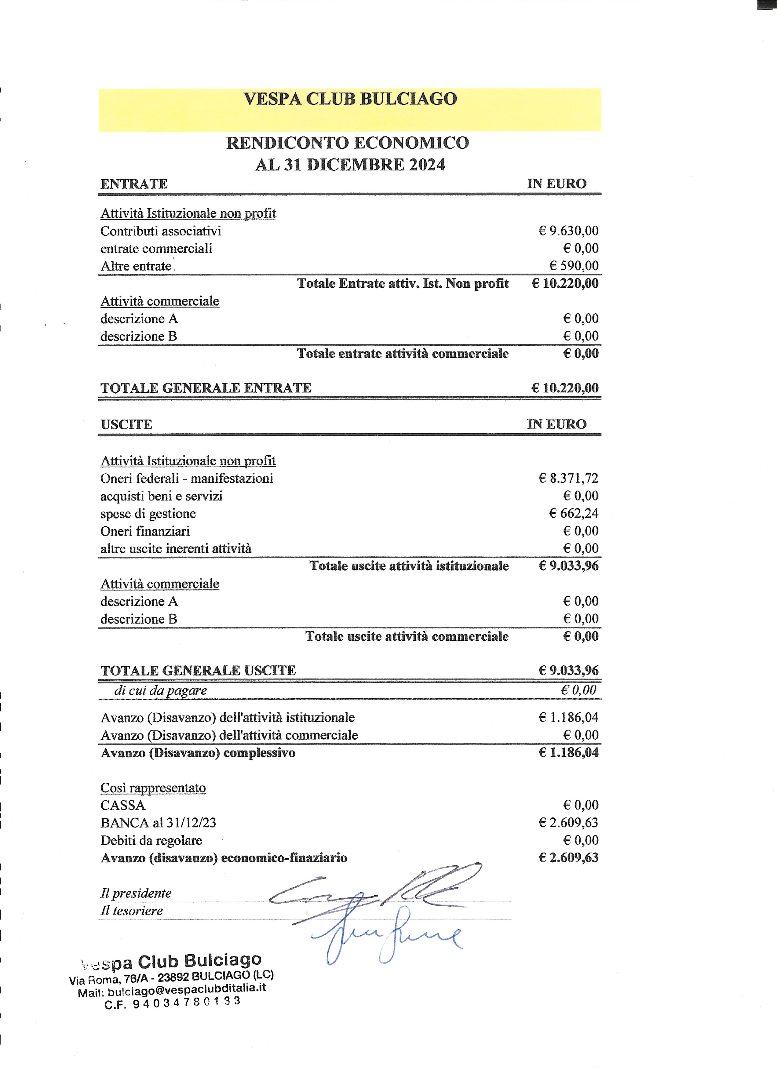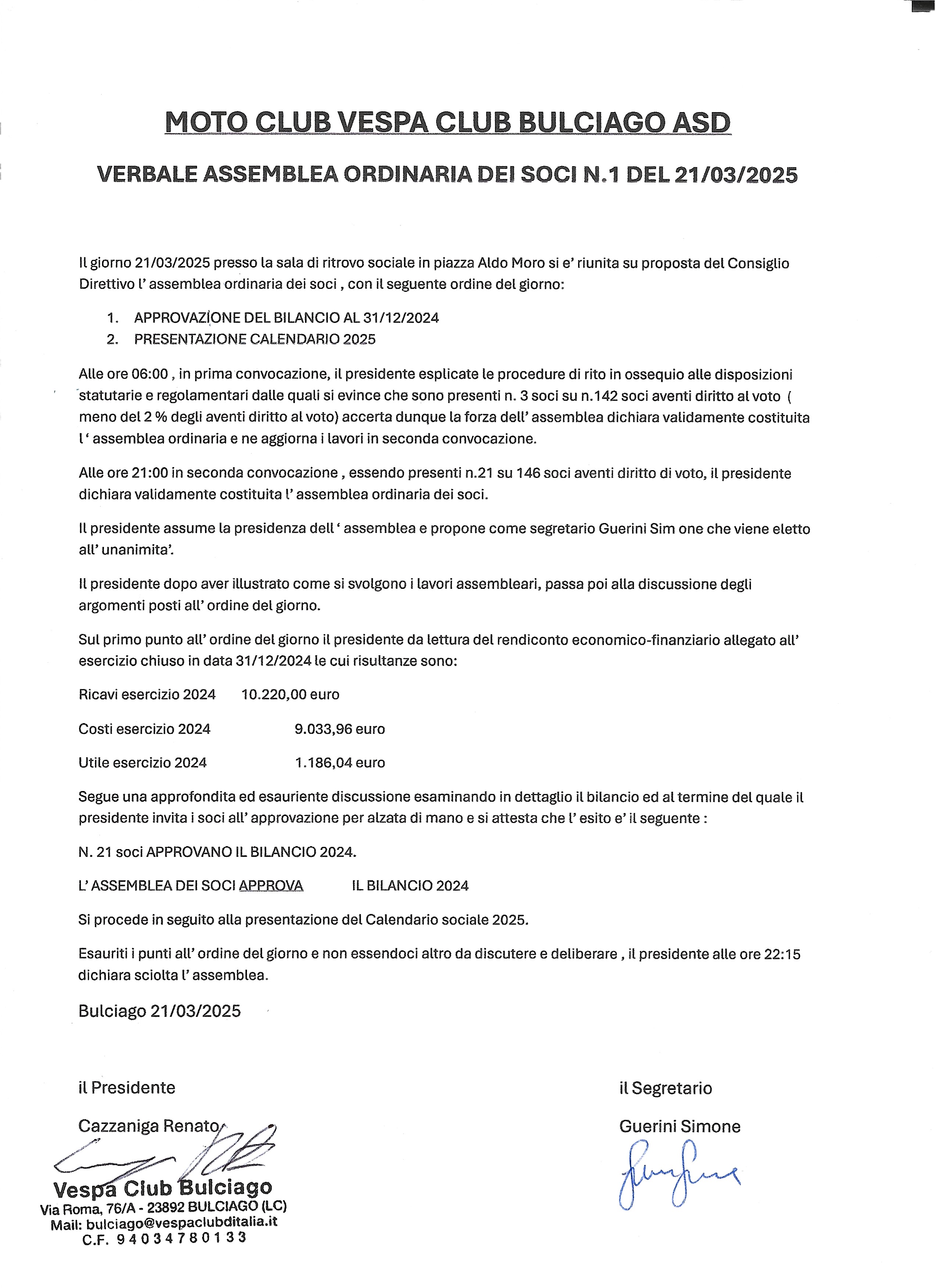 Approvazione Bilancio Dell A.S.D. Moto Club Vespa Club Bulciago